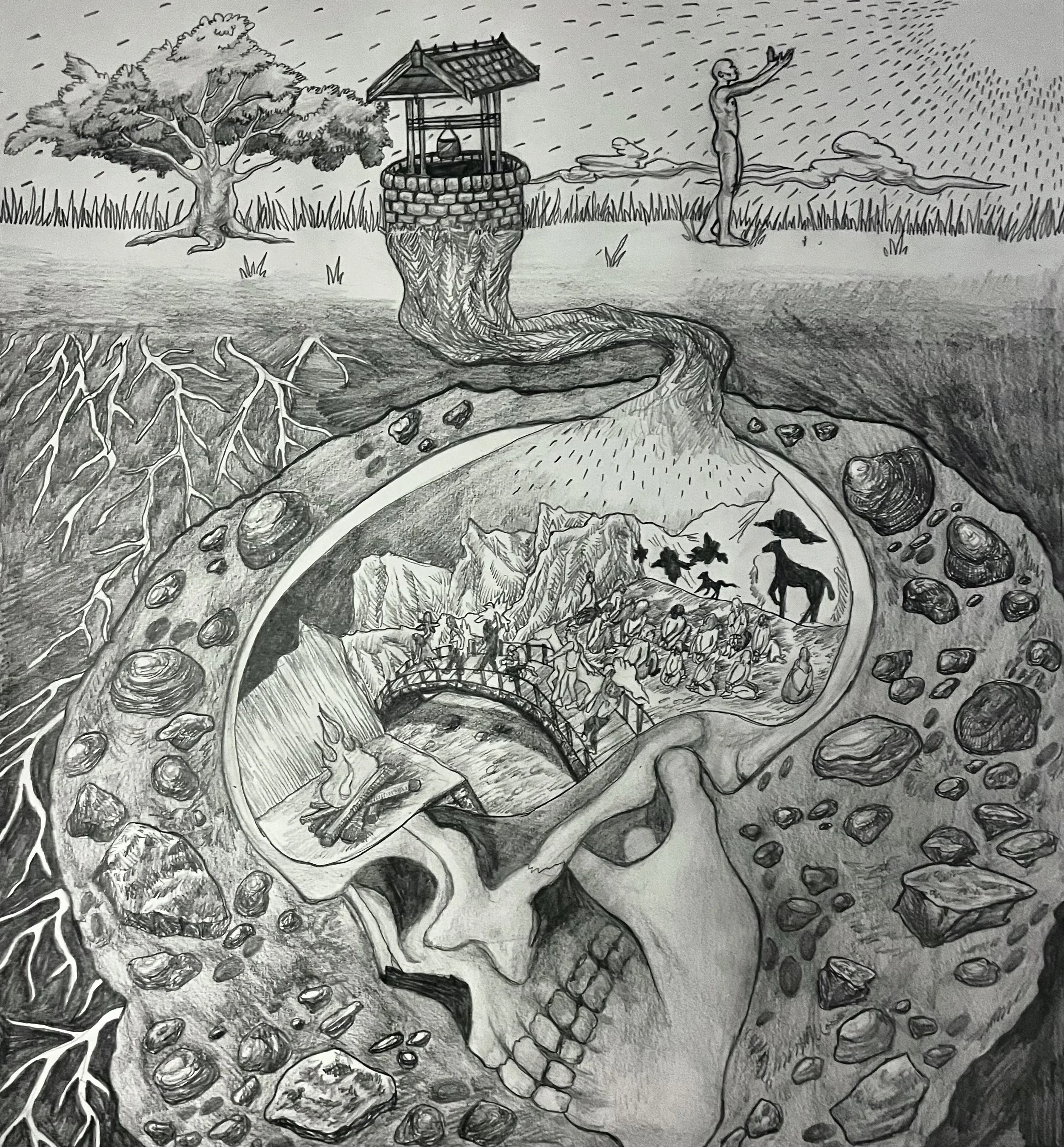 The themes I am attracted to within my own practice concern existentialism, the mysteries of life + death, and hermetic philosophy. Throughout my career I hope to enliven a spirit of wonder within people!